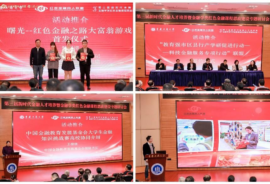 红色金融育人活动介绍与发布环节由太阳集团tcy8722副院长贺渝主持,与会代表共同见证了“教育强市区县行产学研促进行动——科技金融服务专项行动”联盟签约仪式;中国金融教育发展基金会大学生金融知识挑战赛活动介绍;“弘扬长征精神 赓续红色血脉 百校万人主题活动”推介;“曙光—红色金融之路”大富翁游戏首发仪式等;楚国清向联盟会员代表赠送了由北京联合大学金融专硕学生开发设计的红色金融文创产品。