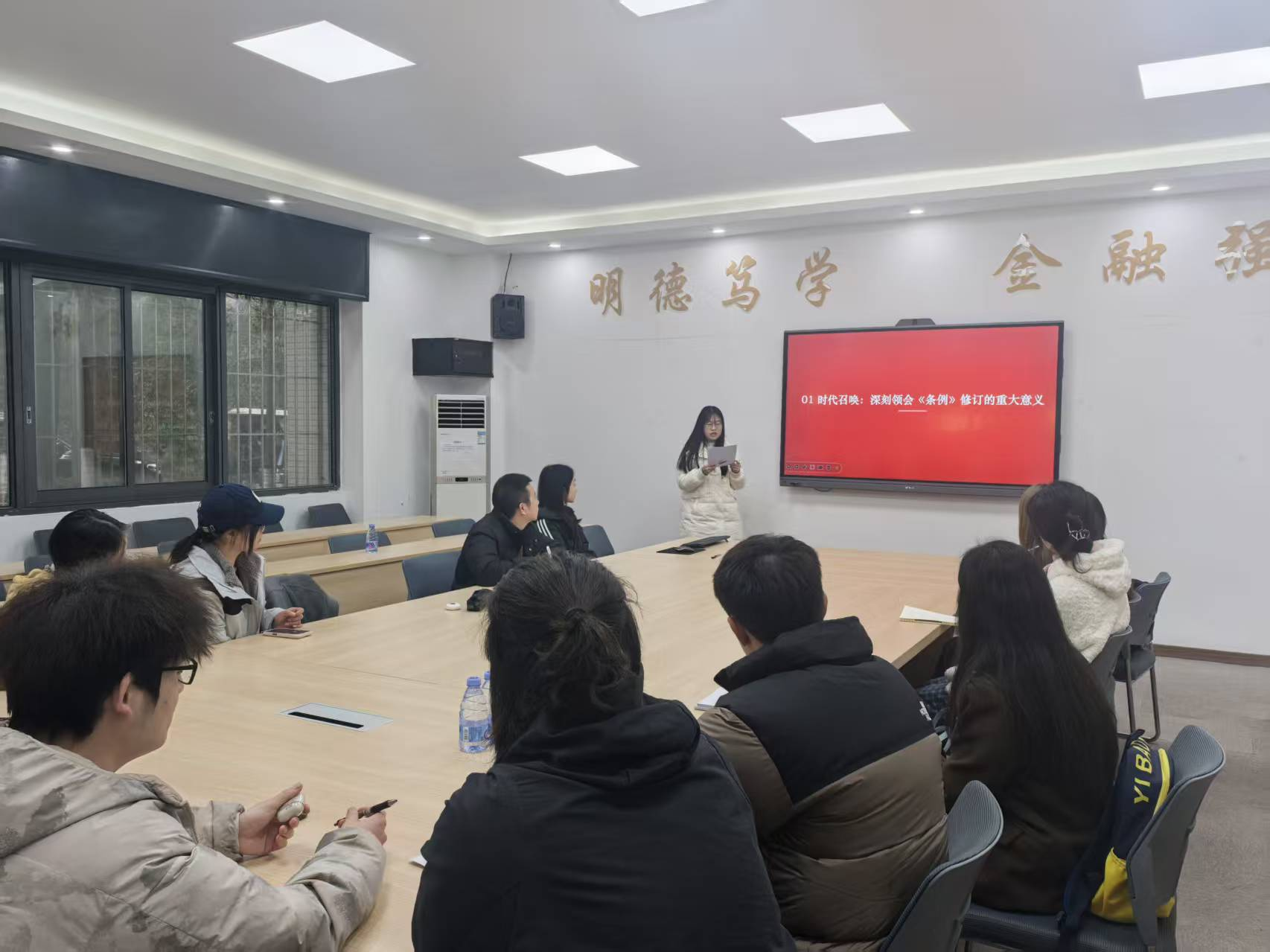 王晓云老师对3位党员的分享内容进行总结和点评,他充分肯定各位同志的深入思考与真诚分享,并特别强调,党员同志要关注时代发展、善于从历史中汲取智慧,做好干事创业的准备。他给大家专题讲述了近期召开的中央经济工作会议精神,指出党员应主动将个人事业发展与国家战略需求紧密结合,尤其在金融领域,要关注经济政策导向,夯实专业本领,为未来服务国家发展打下坚实基础。他要求同志们要认真做好期末复习,主动帮助有学习困难的学生,带领班级树立良好的学风、班风。